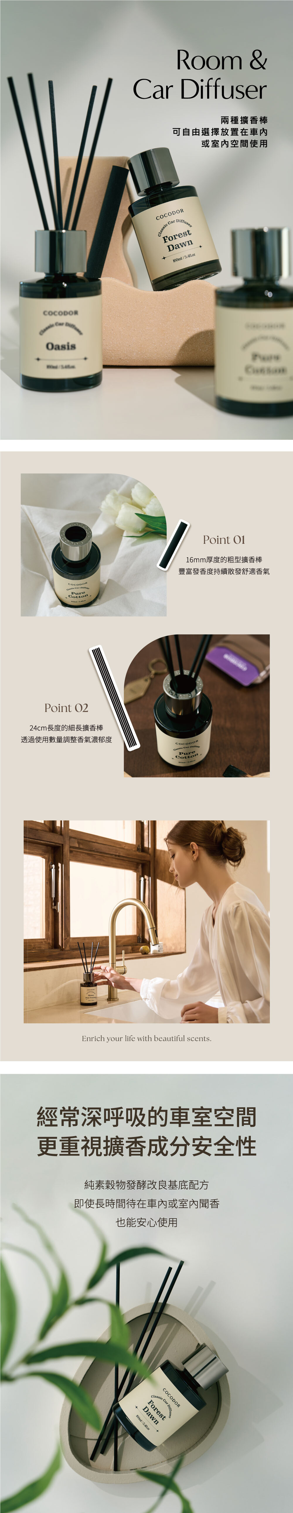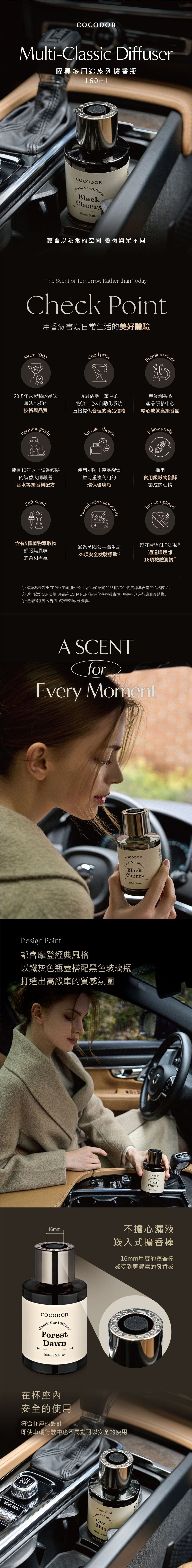 曜黑系列多用途擴香瓶,能感受到高級感的外型設計,採用持久優雅的高等級香料,附上兩種擴香棒,可於車內使用的擴香,放置於家中也是感性的裝飾品,銀灰色的蓋子搭配黑色玻璃瓶打造現代都會風格。