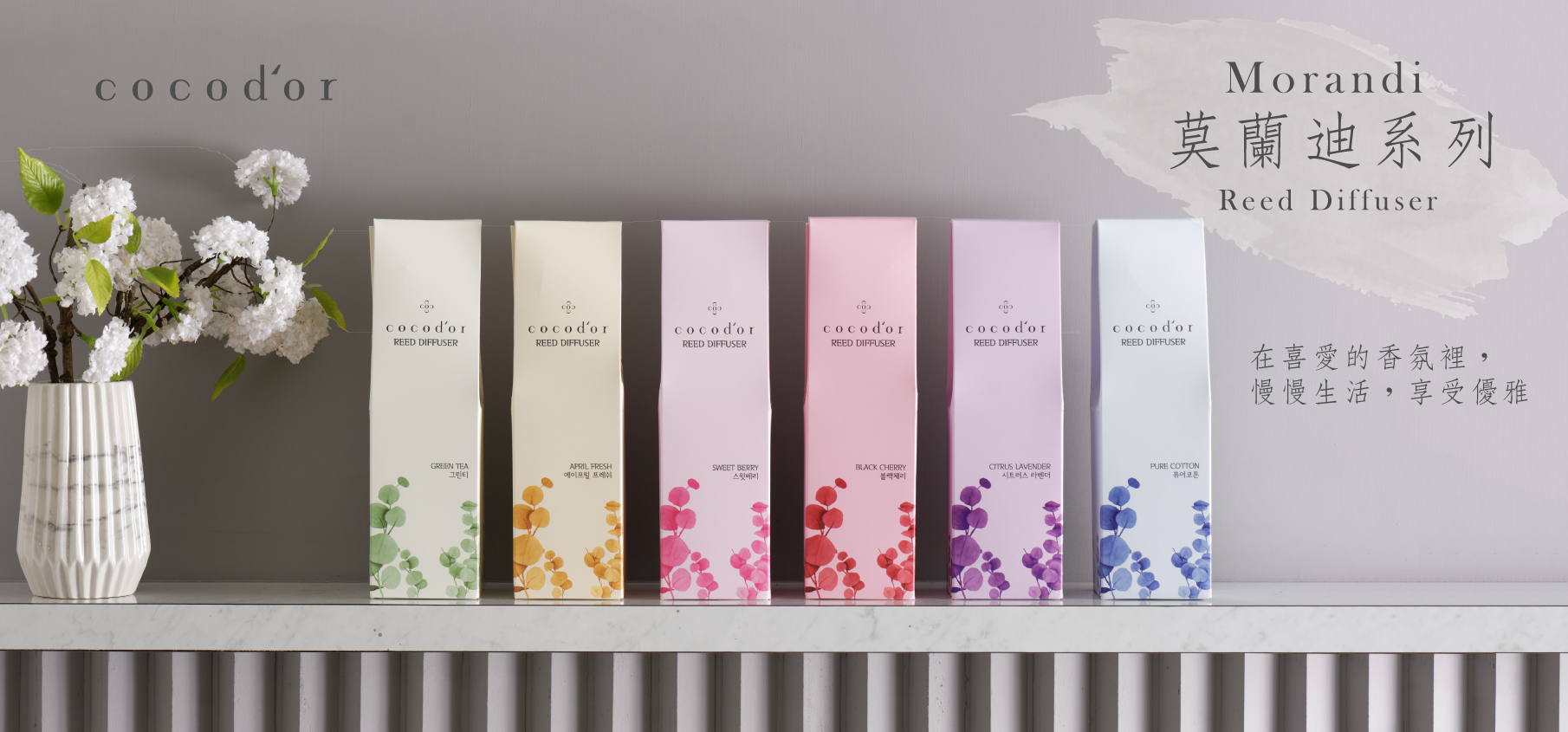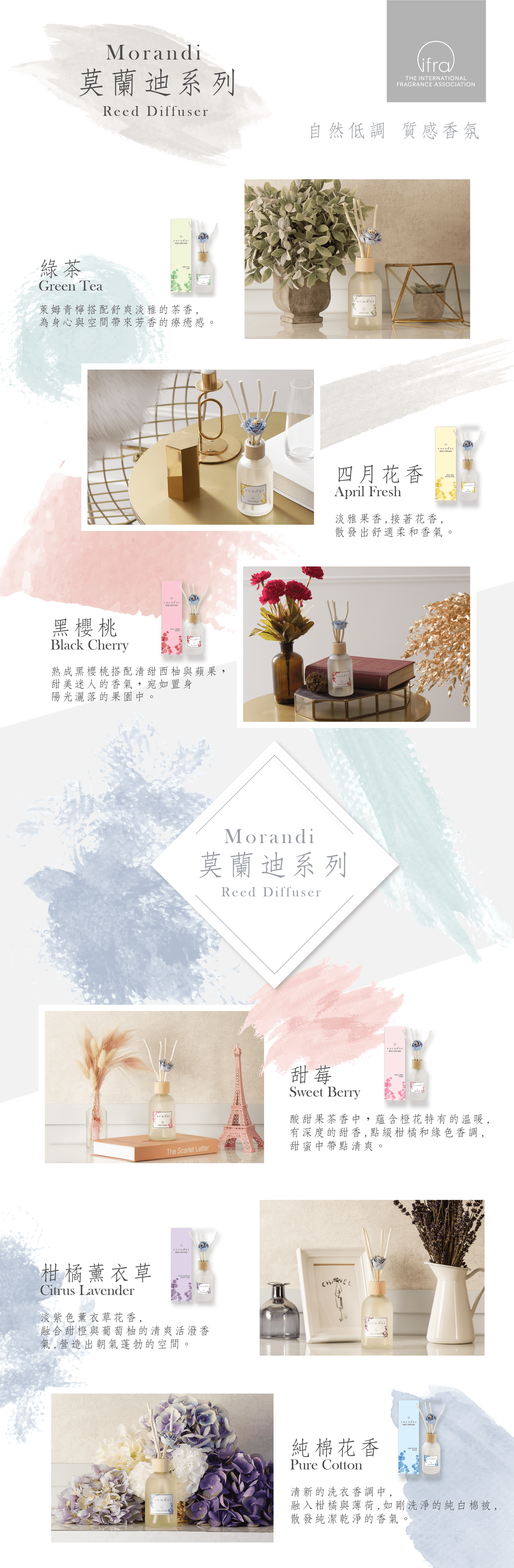 全系列附優雅的擴香花朵及天然藤枝擴香棒,嚴選cocod'or受歡迎的經典香氛:綠茶、黑櫻桃、甜莓、四月花香、柑橘薰衣草、純棉花香。在喜愛的香氛裡慢慢生活,世界再亂,也可以過得很自在愜意。