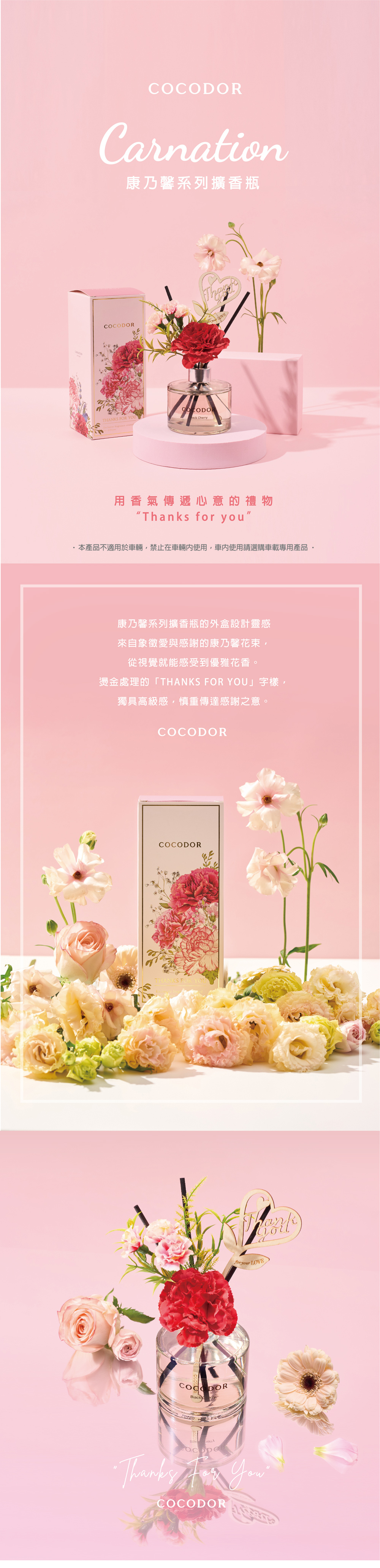 以恆久美麗的康乃馨花束,象徵愛與感謝,搭配宛如鮮花綻放的芬芳香氣,COCODOR為您獻上盛滿誠摯心意的最佳獻禮。