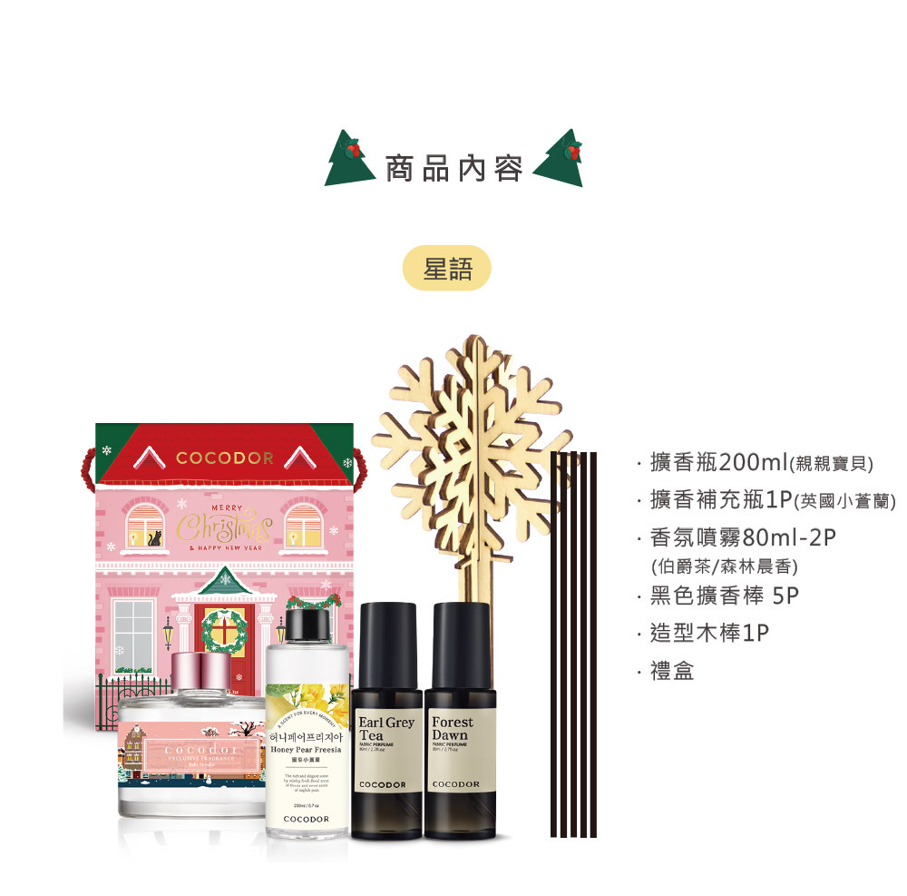 COCODOR陪你度過歡樂佳節,今年聖誕交換禮物就選他!快把你的擴香瓶佈置起來,禮盒裡附有各種裝飾素材,讓家裡充滿歡欣且溫暖的節慶氛圍。