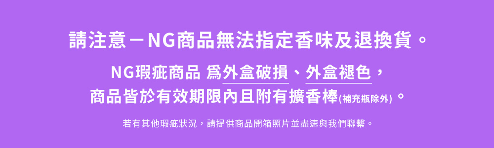 每張訂單限購3組,NG瑕疵商品外盒破損、外盒褪色,商品皆於有效期限內且附有擴香棒(補充瓶除外),恕無法指定香味及退換貨,且不適用滿額贈活動及折抵購物金。